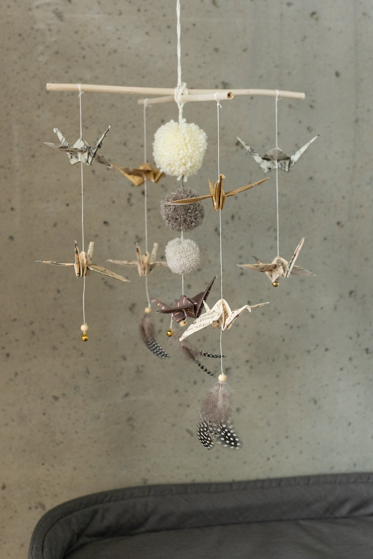 Alles draait inderdaad om de baby. Deze handgemaakte kinderkamer mobiel is een zachte, elegante decoratie die je boven een wieg of in een gezellige hoek van de kamer kunt hangen. De zachte beweging van de papieren kraanvogels en pompons helpt de aandacht van je baby te trekken, wat visuele focus, kalmte en een beetje plezier stimuleert.